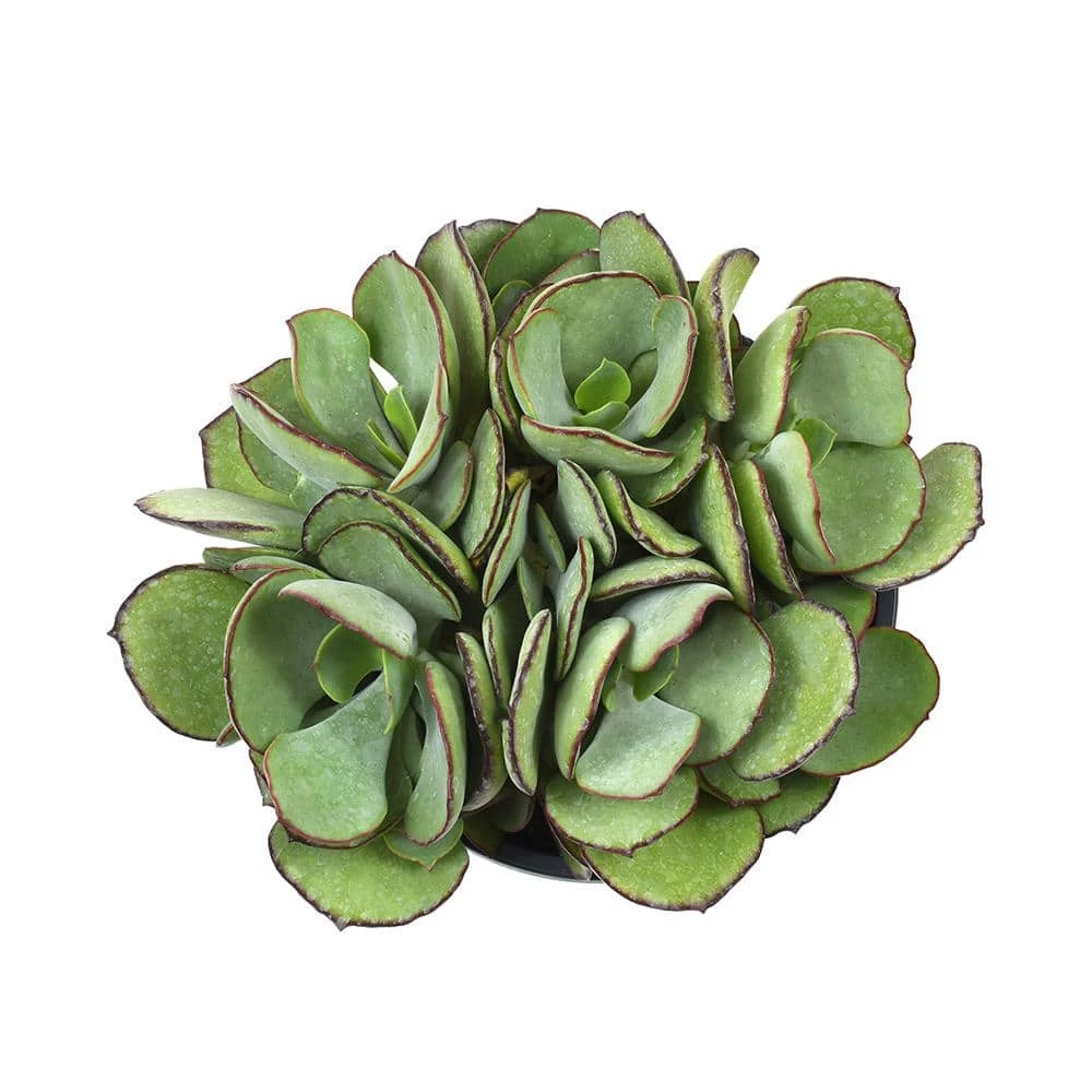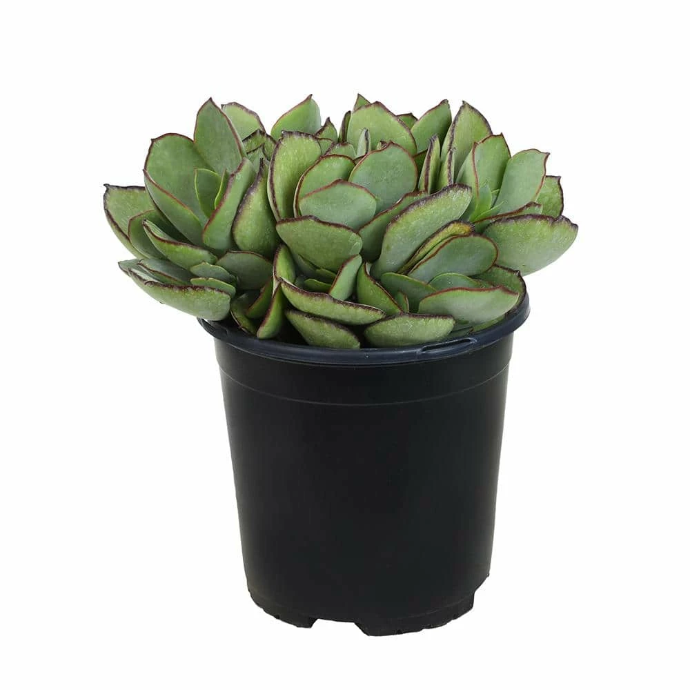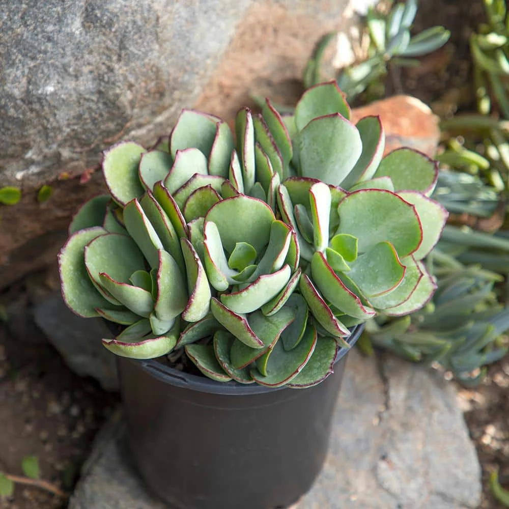 Cotyledon Mint Truffles US PP28,110 is a live succulent plant and patented mint green treat for a drought-tolerant landscape or decorative container on a porch or patio. This shrubby hybrid looks extra sweet and substantial when massed in a succulent garden or firewise landscape with kalanchoes, sedums, and aloes, to name 3 other genera of succulent plants. The mint green leaves are margined with red, the result of the breeder’s desire to create an aesthetically delicious Cotyledon variety with eye-catching color and a tight, low, and lateral growth habit. The unique color of Mint Truffles foliage makes the plant an ornamental counterpart to classic cotyledons such as pig’s ear (Cotyledon orbiculata). The hanging, tubular/bell-shaped flowers are like an extra-welcome side of dessert for the eyes and pollinators.