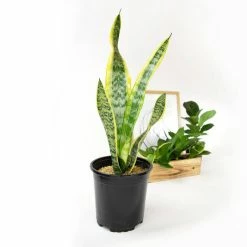 This live snake plant, also known as mother-in-law’s tongue, exhibits an upright form of wavy, wide leaves that taper to sword-like points. The variegated, leathery foliage is outlined in yellow and a streaky mix of gray and green in the center. Sansevieria ‘Laurentii’ is difficult to kill and will survive drought or dimly lit environments. Display by itself, with other snake plants, or complement and contrast with different houseplants and decorative elements. Put simply, this snake plant has a knack for enhancing the feel-good, stress-relieving urban jungle vibes of plant-friendly home decor. There’s a lot going on with ‘Laurentii’, from the fetching coloration to the twisty rigidness of the leaves. Snake plants are heralded for handling low-light spaces, yet you can absolutely place them in bright to moderately bright, indirect light. You can display them outside too, in sun to shade as long as temperatures are mostly on the mild to warm side. As lush and tropical as the leaves might look, snake plants thrive with very little water, making them great plants for forgetful gardeners, travelers, and plant parents who prefer a light-touch approach to plant parenting. They make a perfect housewarming gift. Grows to 3 ft. to 4 ft. tall. Provide a well-draining soil mix designed for succulents. Only water when the soil is thoroughly dry. Water less in winter. Rots easily if overwatered. Hardy to USDA Zone 10/35°F. Protect from frost.