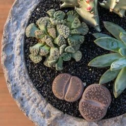 In habitat, mimicry succulents are masters of disguise, blending into their rocky, sandy surroundings as a means for the withstanding harsh elements and hungry wildlife. Known by evocative names such as stone faces, split rocks, tiger jaws, and baby toes, mimicry succulents are great for a conversation-sparking container, well-draining novelty pot, or between actual stones in a rock garden or window box. In cultivation, where survival does not rely on being mostly buried under coarse sand, these delightfully peculiar actors look best in bright spaces that enjoy some protection from toasty afternoon sun. That could be near or on a sunny (but not oven-like) windowsill or outside in primarily morning sun. Mimicry plants produce daisy-like flowers (often yellow but also colors such as rose and pink) that open in the afternoon and close around dusk, repeating this pattern for several days. Plants generally grow to 2 in. to 4 in. high and wide. Provide bright light. Water thoroughly when soil is dry, particularly during the active growing season (spring and fall months). Prefer excellent drainage and are sensitive to waterlogged soils. Typically flower summer to fall. Hardy to Zone 10/32°F.