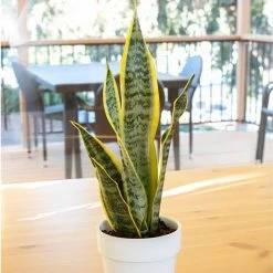 This live snake plant, also known as mother-in-law’s tongue, exhibits an upright form of wavy, wide leaves that taper to sword-like points. The variegated, leathery foliage is outlined in yellow and a streaky mix of gray and green in the center. Sansevieria ‘Laurentii’ is difficult to kill and will survive drought or dimly lit environments. Display by itself, with other snake plants, or complement and contrast with different houseplants and decorative elements. Put simply, this snake plant has a knack for enhancing the feel-good, stress-relieving urban jungle vibes of plant-friendly home decor. There’s a lot going on with ‘Laurentii’, from the fetching coloration to the twisty rigidness of the leaves. Snake plants are heralded for handling low-light spaces, yet you can absolutely place them in bright to moderately bright, indirect light. You can display them outside too, in sun to shade as long as temperatures are mostly on the mild to warm side. As lush and tropical as the leaves might look, snake plants thrive with very little water, making them great plants for forgetful gardeners, travelers, and plant parents who prefer a light-touch approach to plant parenting. They make a perfect housewarming gift. Grows to 3 ft. to 4 ft. tall. Provide a well-draining soil mix designed for succulents. Only water when the soil is thoroughly dry. Water less in winter. Rots easily if overwatered. Hardy to USDA Zone 10/35°F. Protect from frost.
