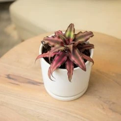 Nicknamed earth stars, these wonderfully colorful bromeliads make great houseplants. Unlike many of their bromeliad brethren, earth stars (or starfish plants) are terrestrial bromeliads, meaning they live in the ground. Growing in a star-shaped rosette of tapering, pointed leaves low to the ground (aka earth), this variety blushes a lovely pink on its foliage. The leaves, with tiny teeth along wavy margins, also get their visual punch from their stripes. Native to leafy forest floors of Brazil, earth stars appreciate indirect light and medium to high humidity. Diffused or dappled light is your earth star’s best bud. Speaking of buds, Cryptanthus bivittatus only bloom once, delicate white flowers, but should that happen you can expect to have little pups ready to carry on for mama. To achieve deeper coloring, you can give the plant brighter light, but take care with direct sunlight, as too much can burn or bleach the leaves. Find a nice spot in your kitchen or even bathroom, or near a window but away from intense direct rays. Earth stars, with their appreciation of humidity, are striking candidates for a terrarium. Out in the garden, look for a prime spot under the canopy of a tree where it can enjoy dappled light or high shade. Growth varies, around 3 in. to 6 in. tall and wide. Provide bright, indirect light. Use a well-draining soil mix that retains some moisture. Water when the soil just begins to dry out. Hardy to Zone 10/35°F. Protect from frost.