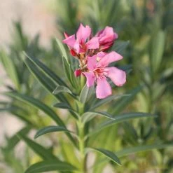 Nerium oleander ‘Turner’s Flirt’ is a petite, compact oleander with many vivid, lightly fragrant dark-pink blooms that even flower well in partial shade. Medium vigor, drought tolerant when established and deer resistant. Sun loving and salt tolerant as well, this oleander is incredibly durable choice for mild winter climates as a hedge, windbreak or privacy screen, with attractive, lance-shaped glossy green leaves. Shows high resistance to root rot, powdery mildew and leaf spot. Please note that all parts of plant are toxic if eaten.