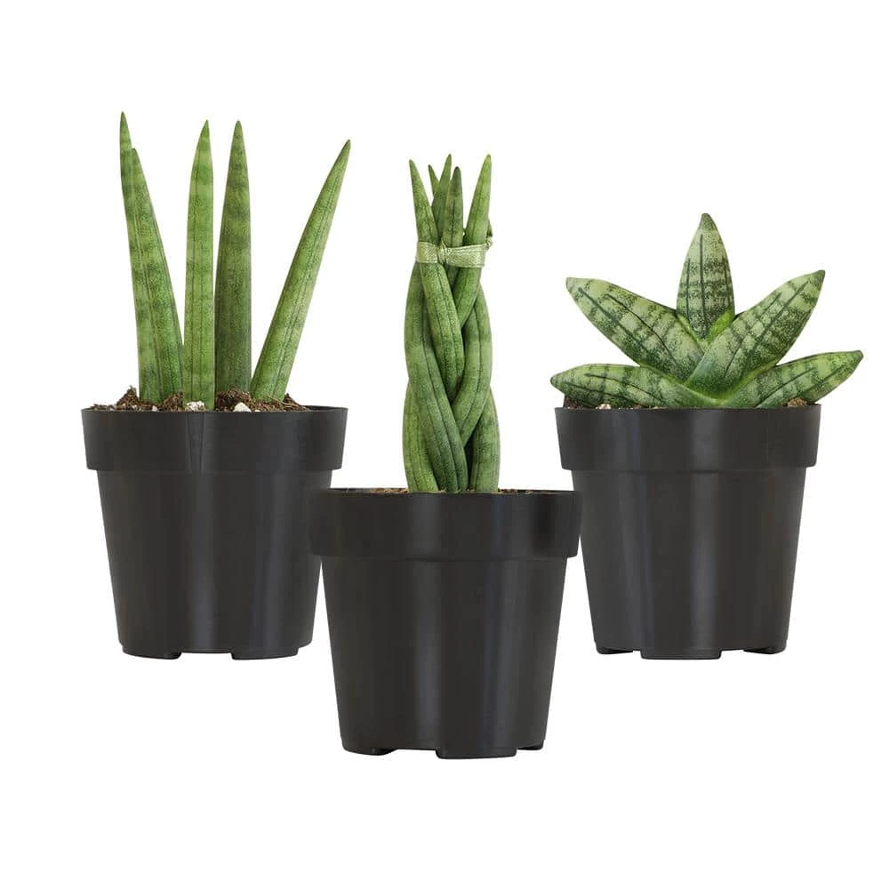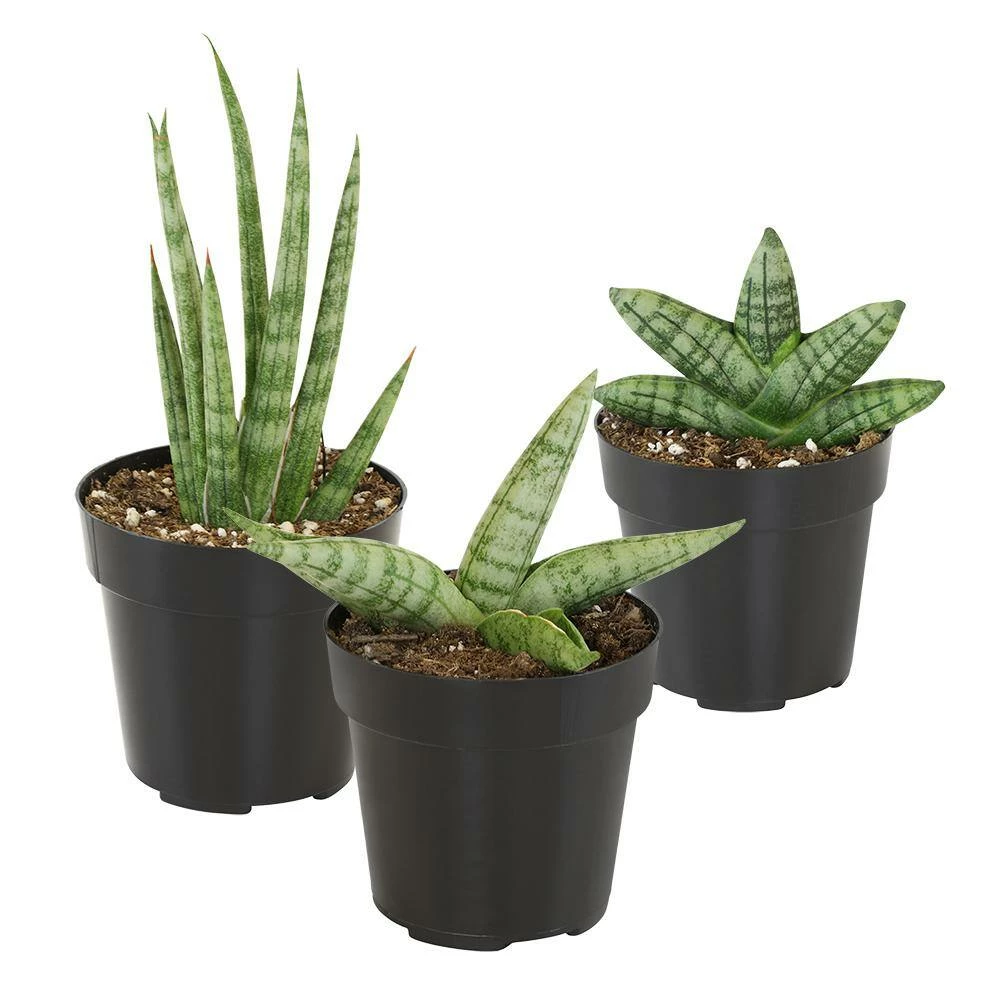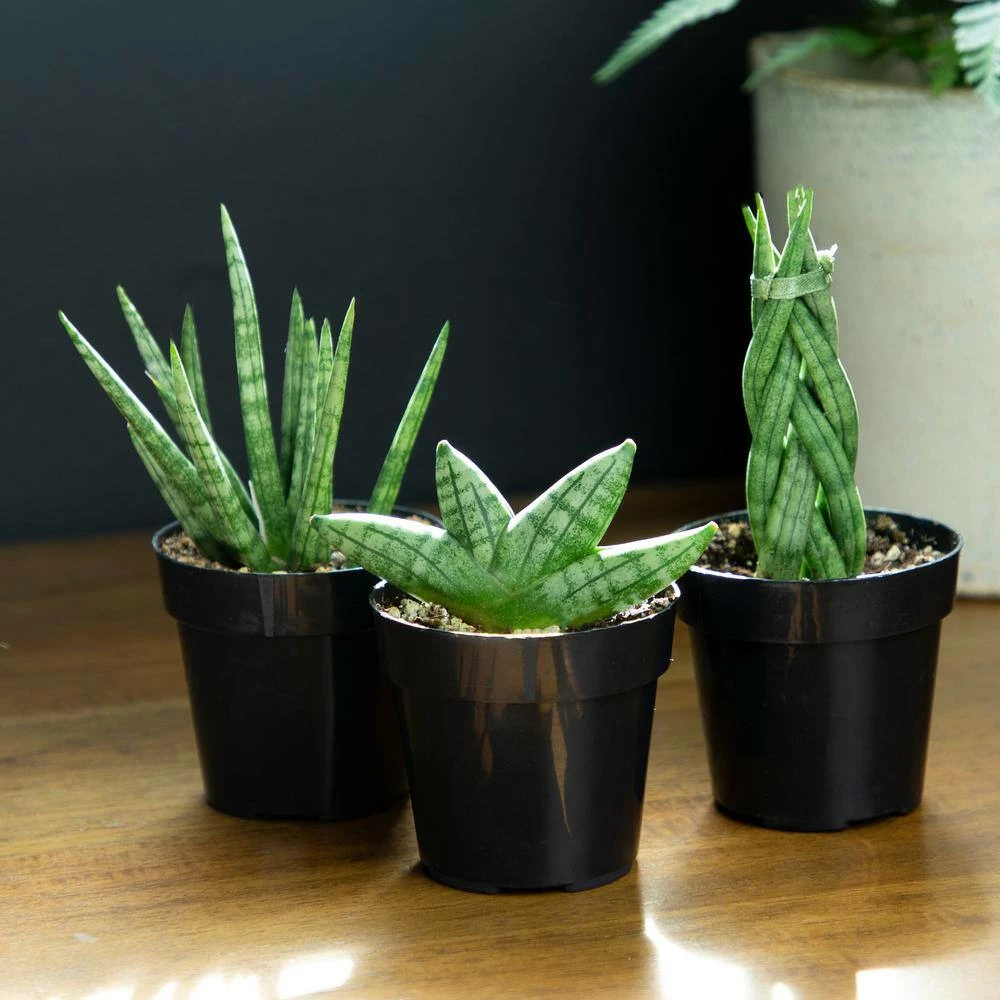 These tough, evergreen, drought-tolerant succulents, commonly known as snake plants, are a super way to enhance the feel-good, stress-relieving urban-jungle vibes of your home decor. Arriving in 2.5 in. pots and not in any hurry to go on a growth spurt, these quirky, slow-growing succulent plants reward those who are happy to pick out a pot and make it a plant’s home for the foreseeable future. The snakes we grow for this 3-pack are a visually versatile bunch. The intriguing group features attractive banding on the leaves and a variety of shapes, from braided and those resembling spiky fingers or spears to 2 that look like variegated green starfish. Snake plants are ideal for beginning plant parents because they almost have to be killed on purpose (water, then water again, followed by more water) and can easily survive drought and dimly lit environments. Even so, you can place your snake plants in medium to bright, indirect light locations inside, say near a window or on a living room bookshelf, plant shelf or kitchen counter. Snake plants can even be enjoyed outdoors, particularly in partially shaded areas away from warm direct sun. Keep sansevierias happy by planting them in well-draining soil and watering around once every 2-weeks. monthly in winter. It’s optional, but you can feed once in spring and once in summer with a liquid houseplant fertilizer diluted to half strength. Hardy to USDA Zone 10°F/35°F.