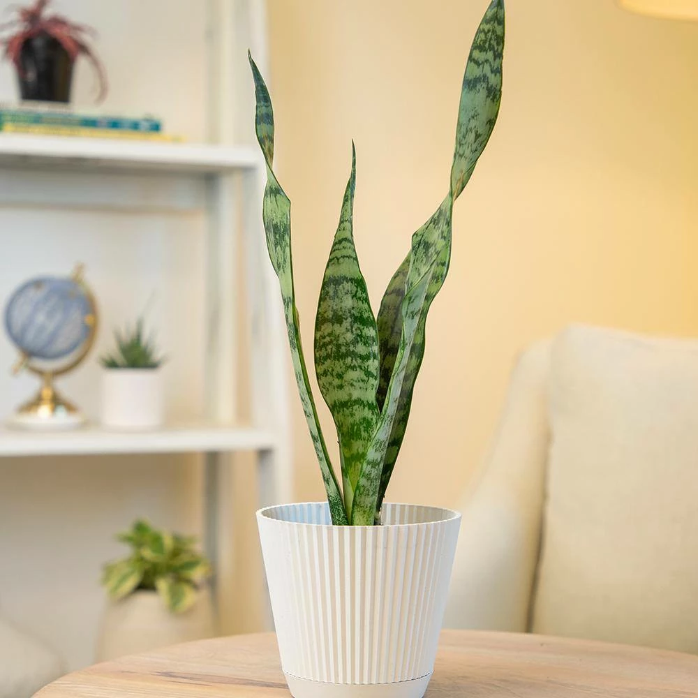 Aesthetically on point and amazingly resilient, needing very little while looking great year-round, Sansevieria zeylanica offers endless possibilities to refresh and enhance any living space. This live snake plant, also known as Ceylon bowstring hemp or devil’s tongue, exhibits an upright form of variegated sword-shaped leaves that taper to points. The leaves are a stripe-y mix of dark green and light gray-green. Native to Sri Lanka, this plant is difficult to kill and will survive drought or dimly lit environments. Sansevieria zeylanica comes in a white drop-in planter that complements its modern and stylish good looks. While it’s heralded for handling low-light spaces, you can absolutely place the plant in moderate- to bright-light spots. You can also grow it outside in sun to shade as long as temperatures are mostly on the mild to warm side. As lush, full and tropical as the leaves look, snake plants thrive with very little water, making them great plants for beginners, forgetful gardeners, travelers and plant parents who prefer a light-touch approach to plant parenting. They make perfect housewarming gifts. Grows to 2 ft. to 3 ft. tall. Provide a well-draining soil mix designed for succulents. Only water when the soil is thoroughly dry. Water less in winter. Rots easily if overwatered. Hardy to USDA Zone 10°F/35°F. Protect from frost.