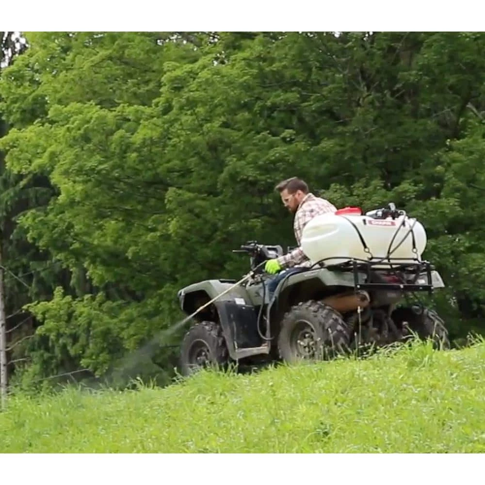 The Chapin EZ Mount Dripless Sprayer has been easily configured to mount to your standard ATV, UTV or lawn tractor. The EZ Mount has a 25 Gal. heavy-duty, translucent, chemical resistant tank with a 5 in. W tank opening for easy filling and mixing. Featuring a 2.0 GPM 12-Volt diaphragm pump with quick connect alligator clips, maximum pressure of 60 psi delivering a 30 ft. maximum vertical spray and a 26 ft. maximum horizontal spray. A double filtration system extends the life of the sprayer. Manifold with pressure Gauge. 15 ft. ratchet straps included. Optional 7 ft. and 16 ft. coverage spray boom kits available.
