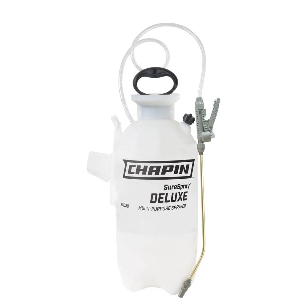 The Chapin SureSpray Deluxe Sprayer is ideal for the homeowner and the professional. The 3-gallon translucent poly tank with Clean’n Easy design has a large funnel-top opening for no mess filling and cleaning, the unique SureSprayAnti-Clog Filter for clog-free spraying, curved brass wand and poly nozzle. Includes an on board measuring cup for accurate chemical mixing, a spray shield to protect plants, reinforced hose, ergonomic pump handle, and pressure relief valve.