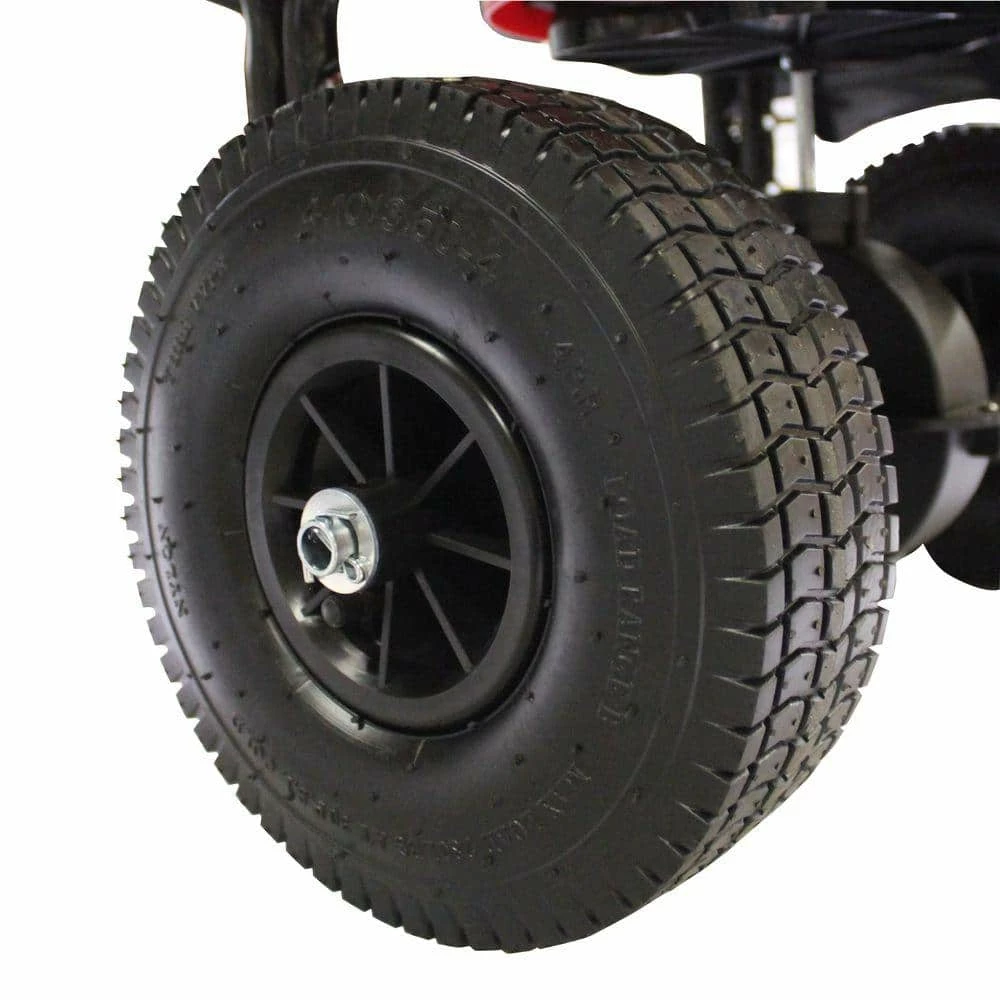 - 10-inch wide pneumatic tires for stability over uneven terrain