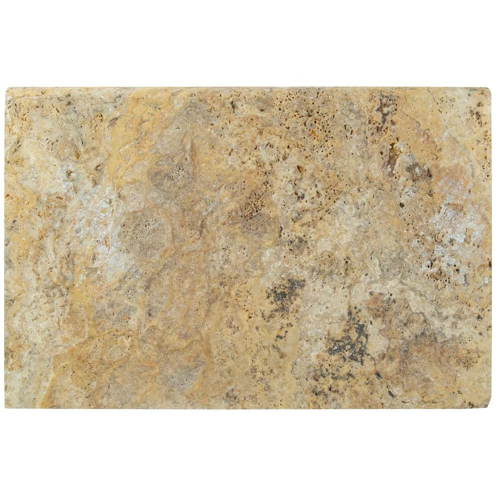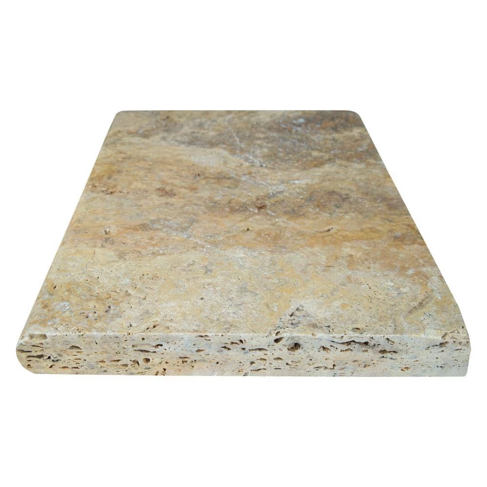 MS International Scabas 16 in. x 24 in. Honed-unfilled Travertine Pool Copings add a timeless Tuscan beauty for your surroundings, outdoors or indoors. Ideal for poolside’s or step treads, these are durable and have various shades of gold and yellow that create a subtle visual interest. With a bullnose on 1 long side, the tile provides various install options that blend seamlessly to create a perfect setting. NOTE: Inspect all tiles before installation. Natural stone products inherently lack uniformity and are subject to variation in color, shade, finish, etc. It is recommended to blend tiles from different boxes when installing. Natural stones may be characterized by dry seams and pits that are often filled. The filling can work its way out and it may be necessary to refill these voids as part of a normal maintenance procedure. All natural stone products should be sealed with a penetrating sealer. After installation, vendor disclaims any liabilities.