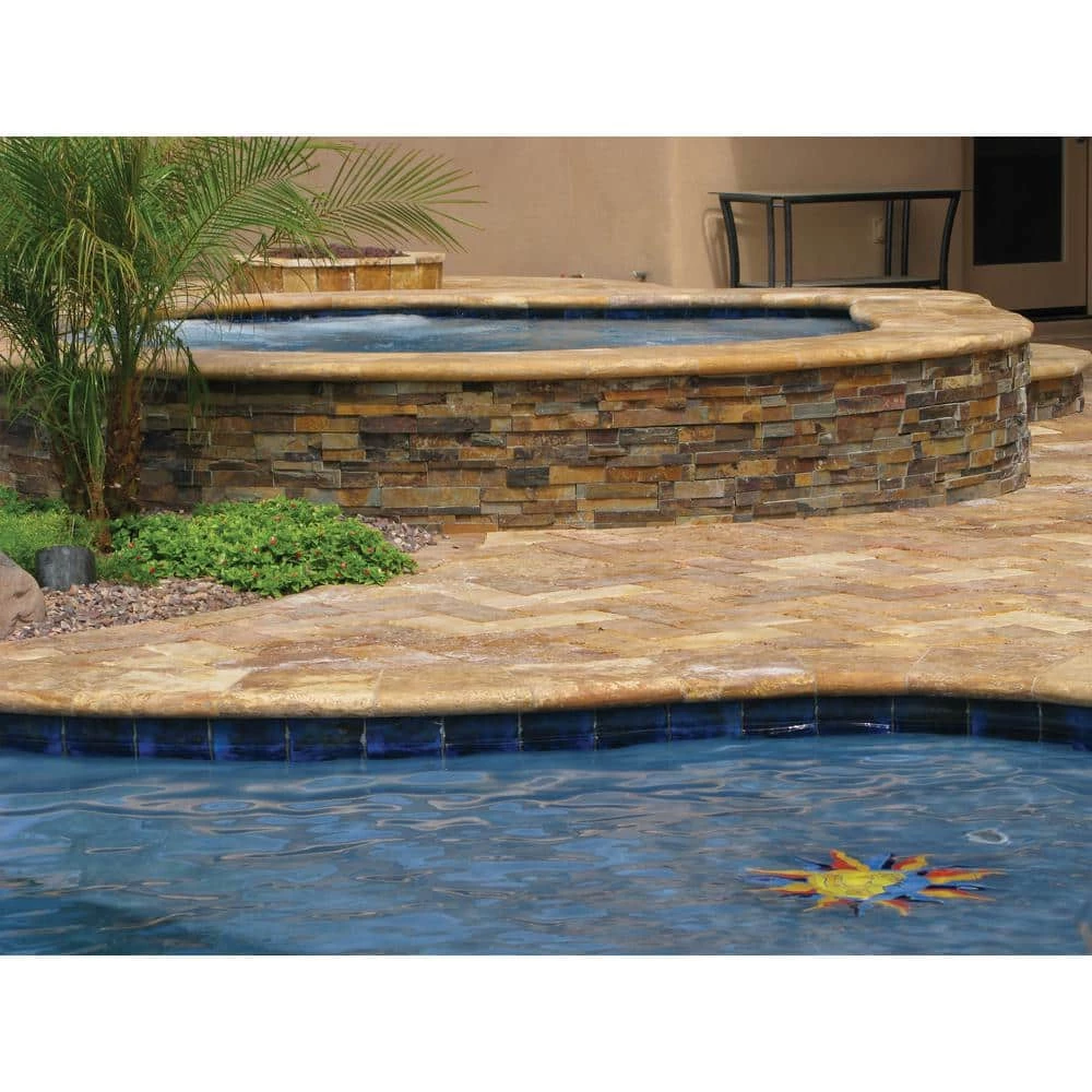 MS International Porcini 16 in. x 24 in. Brushed Travertine Pool Copings add a timeless Tuscan beauty for your surroundings, outdoors or indoors. Ideal for poolside’s or step treads, these are durable and have various shades of gold and yellow that create a subtle visual interest. With a bullnose on one long side, the tile provides various install options that blend seamlessly to create a perfect setting. NOTE: Inspect all tiles before installation. Natural stone products inherently lack uniformity and are subject to variation in color, shade, finish, etc. It is recommended to blend tiles from different boxes when installing. Natural stones may be characterized by dry seams and pits that are often filled. The filling can work its way out and it may be necessary to refill these voids as part of a normal maintenance procedure. All natural stone products should be sealed with a penetrating sealer. After installation, vendor disclaims any liabilities.